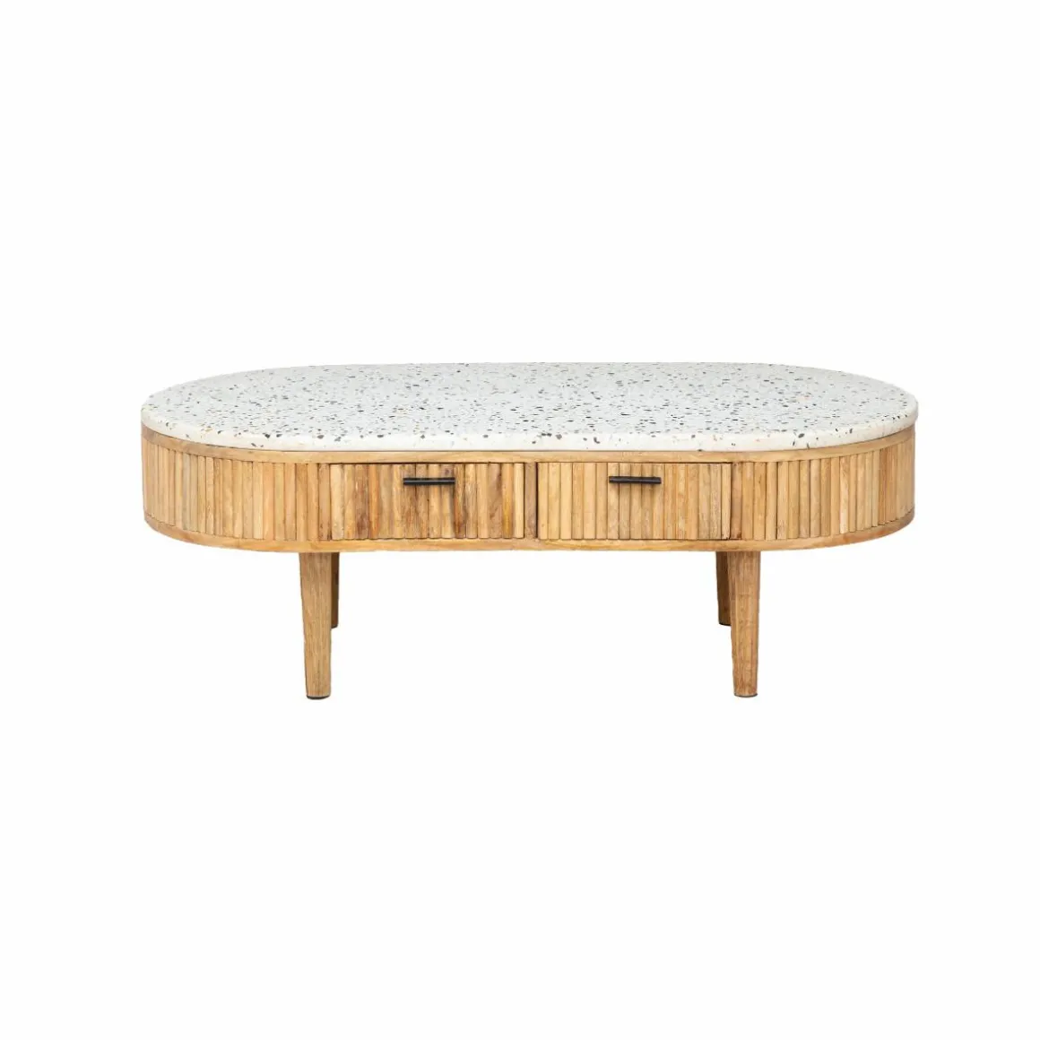 Voici la table basse chic et moderne Ambrine ! Cette superbe pièce de la collection Ambrine ajoutera un style intemporel au cœur de votre maison. Fabriquée avec un plateau en terrazzo blanc et une base en bois de manguier, cette pièce est parfaite pour les espaces de vie modernes et contemporains et crée une belle texture pour un look accrocheur.