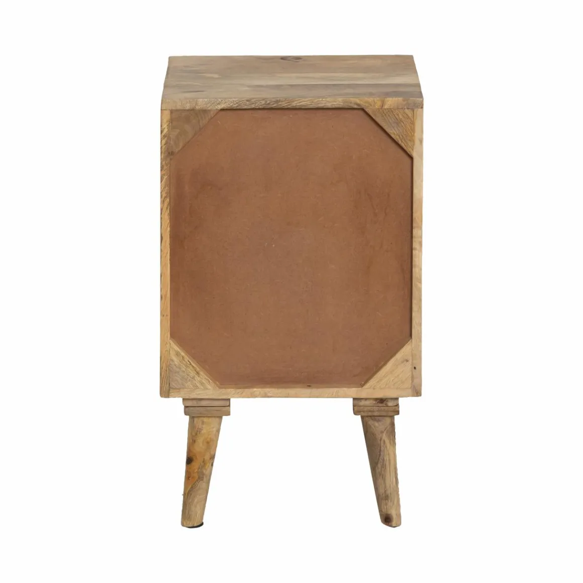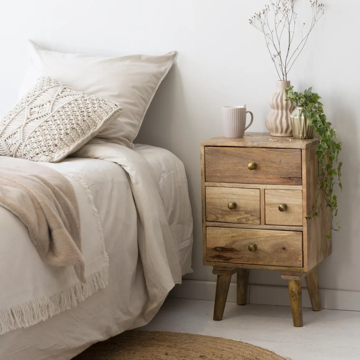 Conçue en bois de manguier, elle diffuse des nuances solaires au quotidien. Elle dispose de 4 tiroirs de taille différente qui vous permettront de ranger vos bouquins, vos bijoux, vos magazines, vos chargeurs… Les fonds de tiroirs et le dos de la table de chevet sont en MDF !