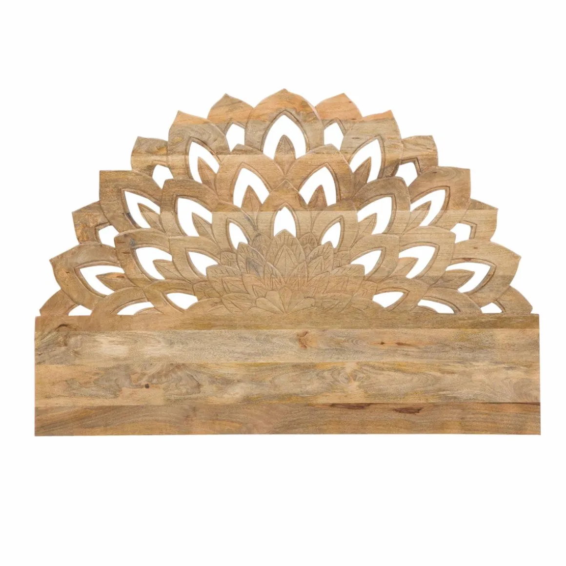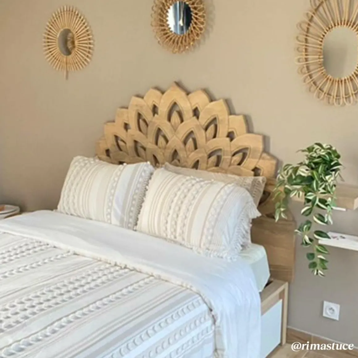 Le bois blanchi a été sculpté de manière à nous rappeler la fleur de lotus. On aime cette sculpture délicate et raffinée. N’hésitez pas à l’associer avec de beaux chevets et de belles lampes à poser pour une décoration douce et chaleureuse qui saura vous apaiser. Elle est idéale pour une chambre parentale et marquera votre espace d’une touche de zenitude.