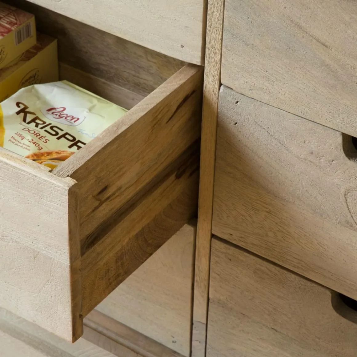 Vous l’aurez compris, ce buffet vasselier est une pépite pour les personnes qui adorent accumuler ! Sa conception 100% manguier le rend très robuste et en fait un meuble qui vous accompagnera durant de nombreuses années. On aime beaucoup les nuances lumineuses qui se dégagent du bois.