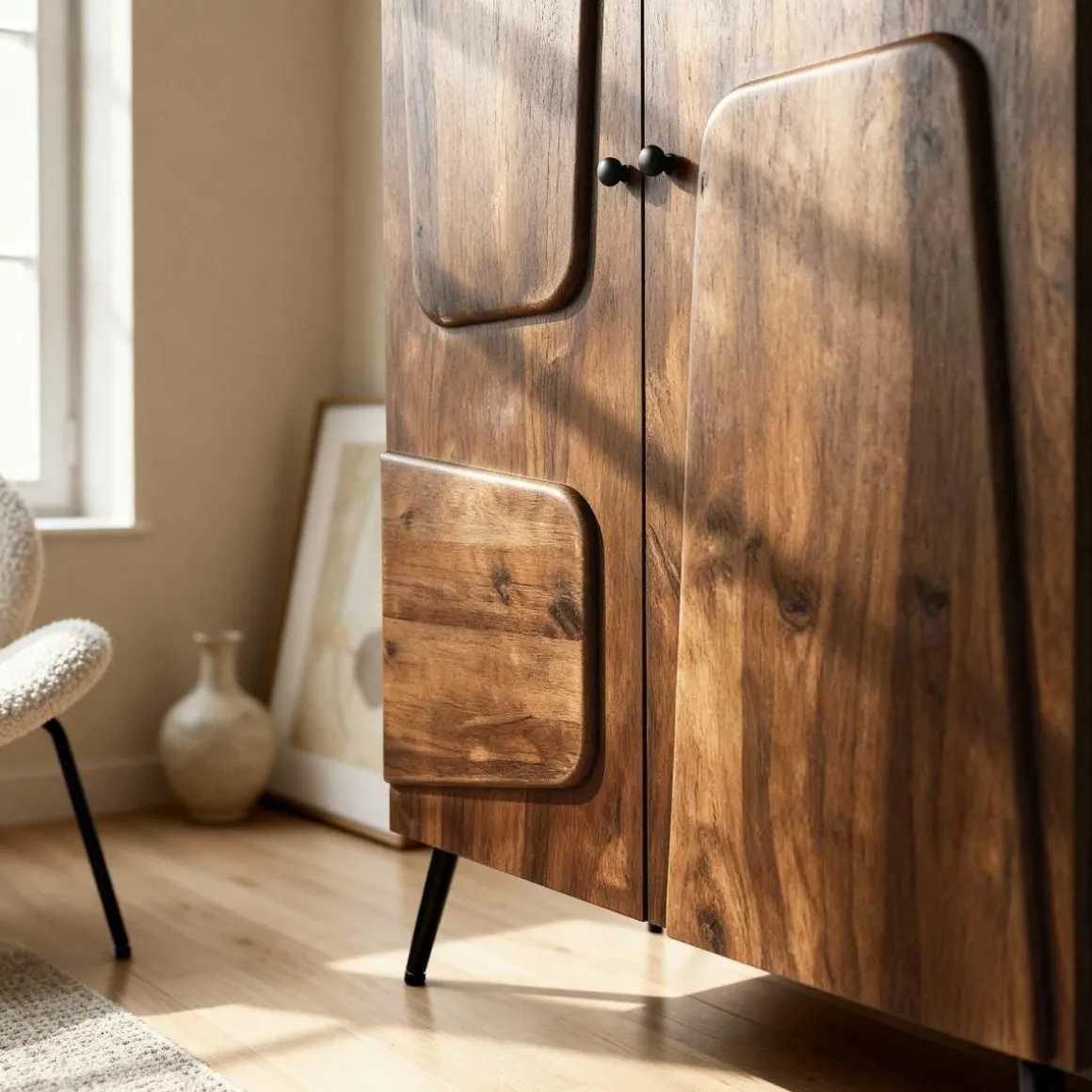 Cette armoire en bois de manguier séduit par son design contemporain et organique, mêlant douceur des formes et robustesse naturelle. Le manguier, reconnu pour son grain riche et ses nuances chaleureuses, confère à cette pièce une authenticité pleine de caractère.