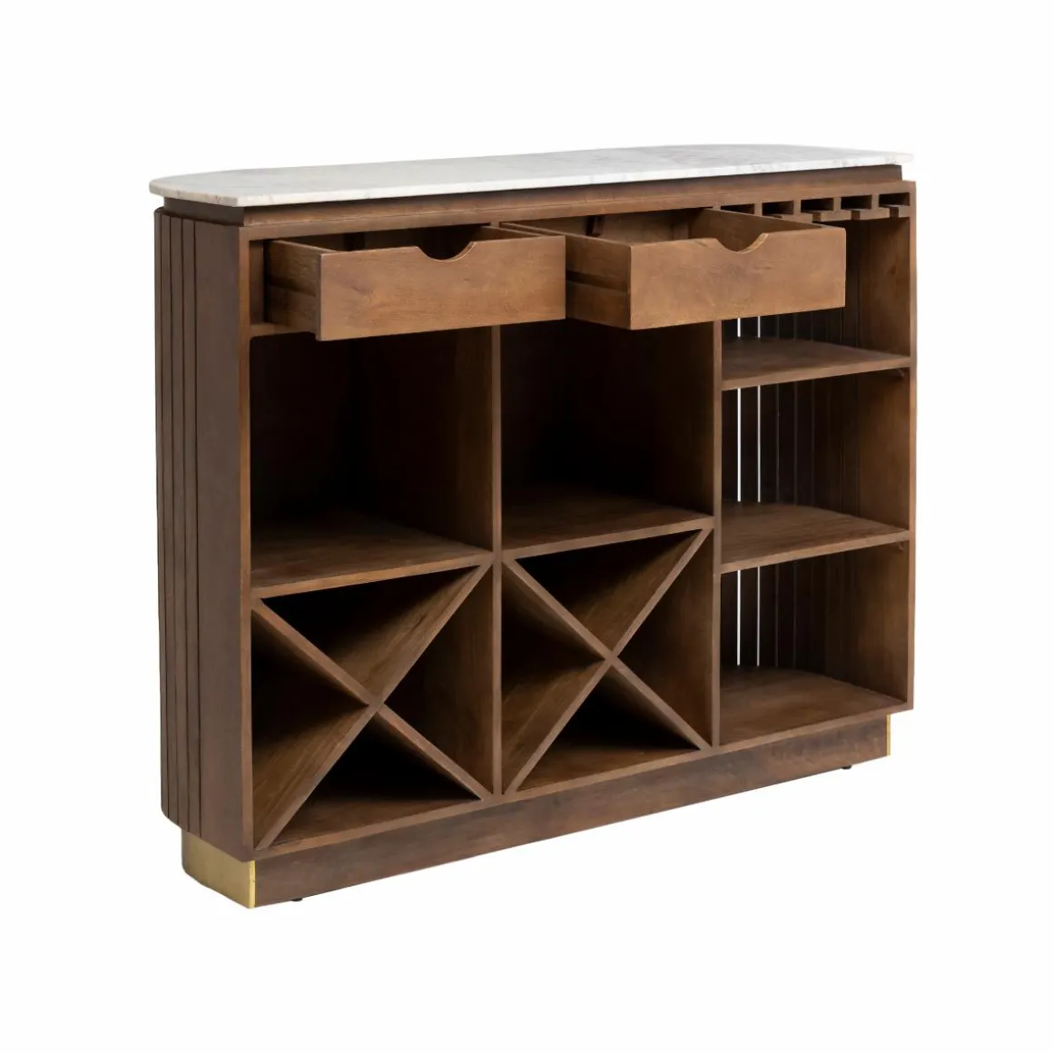 Le bar Sienne est un meuble élégant et fonctionnel pour votre espace de vie. Fabriqué en bois de manguier de qualité, il est doté d’un magnifique pied en métal doré qui ajoute une touche de sophistication à son design.