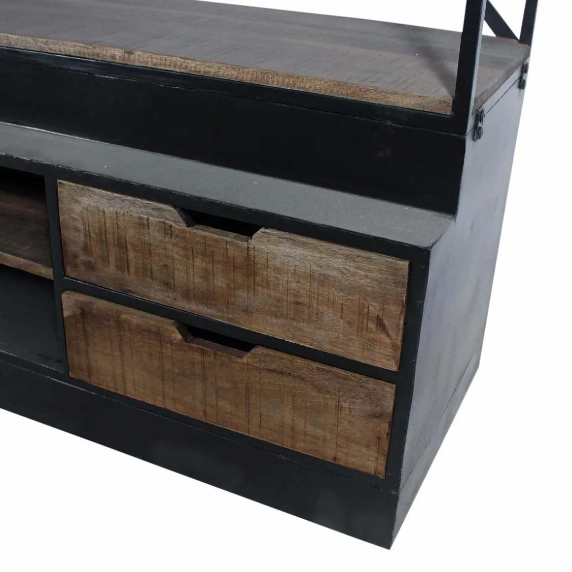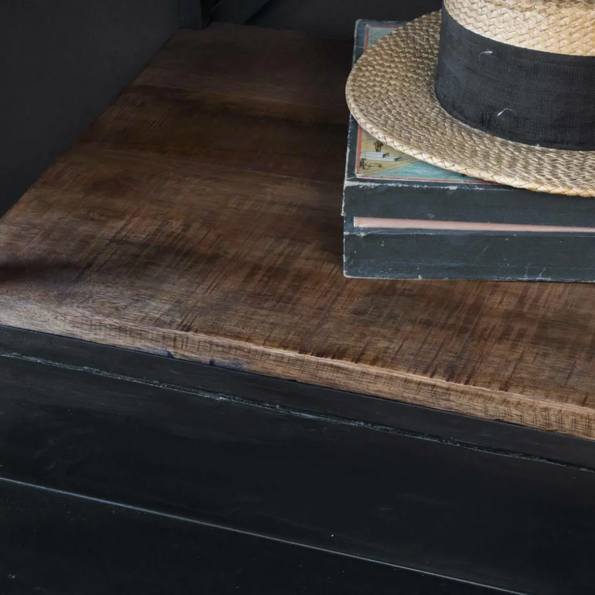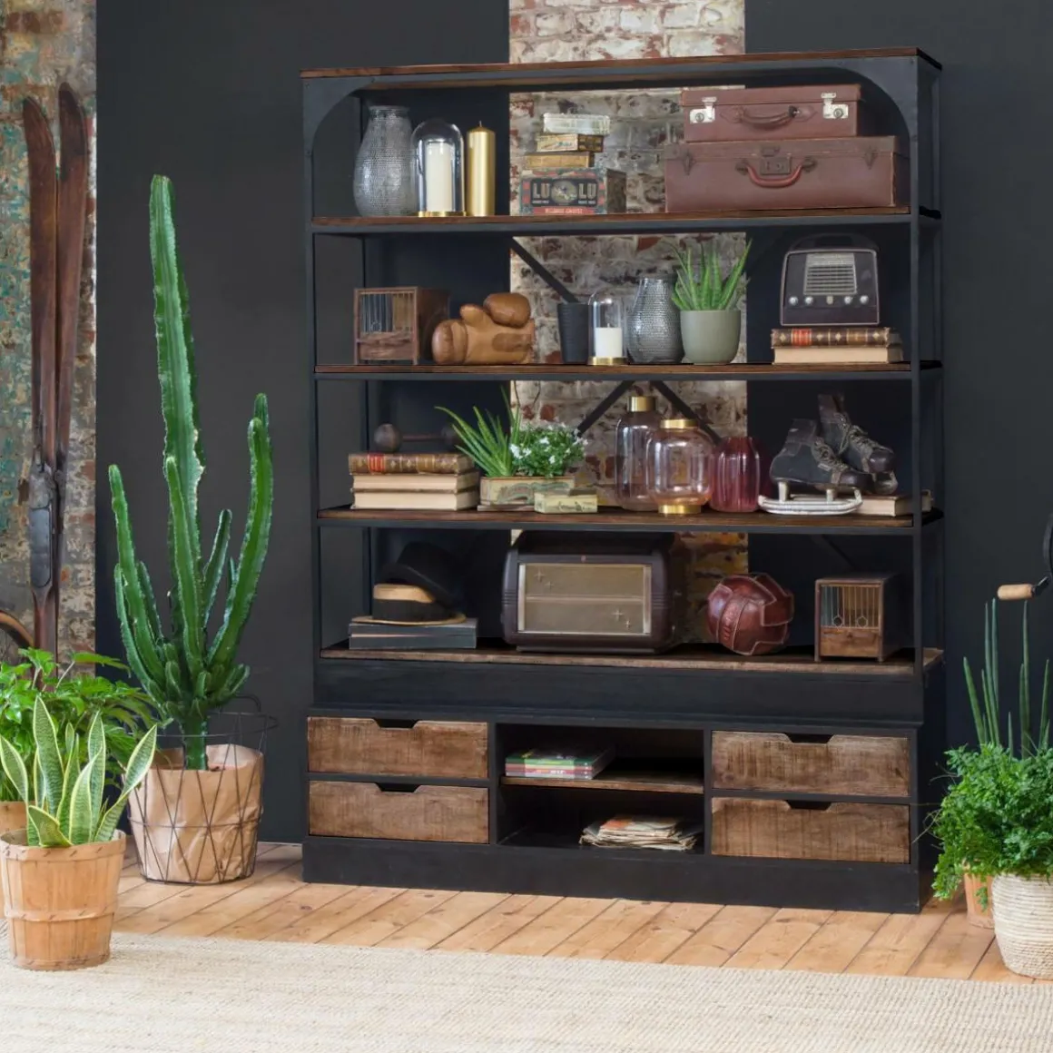 Cette bibliothèque industrielle a été pensée et réalisée de façon à proposer un meuble épuré, minimaliste et surtout intemporel. Sa structure en métal noir s’allie parfaitement avec le bois de manguier. Pour une question de design, il y a une différence de profondeur entre la partie basse et la partie haute. Cela amène une touche de légèreté au meuble.