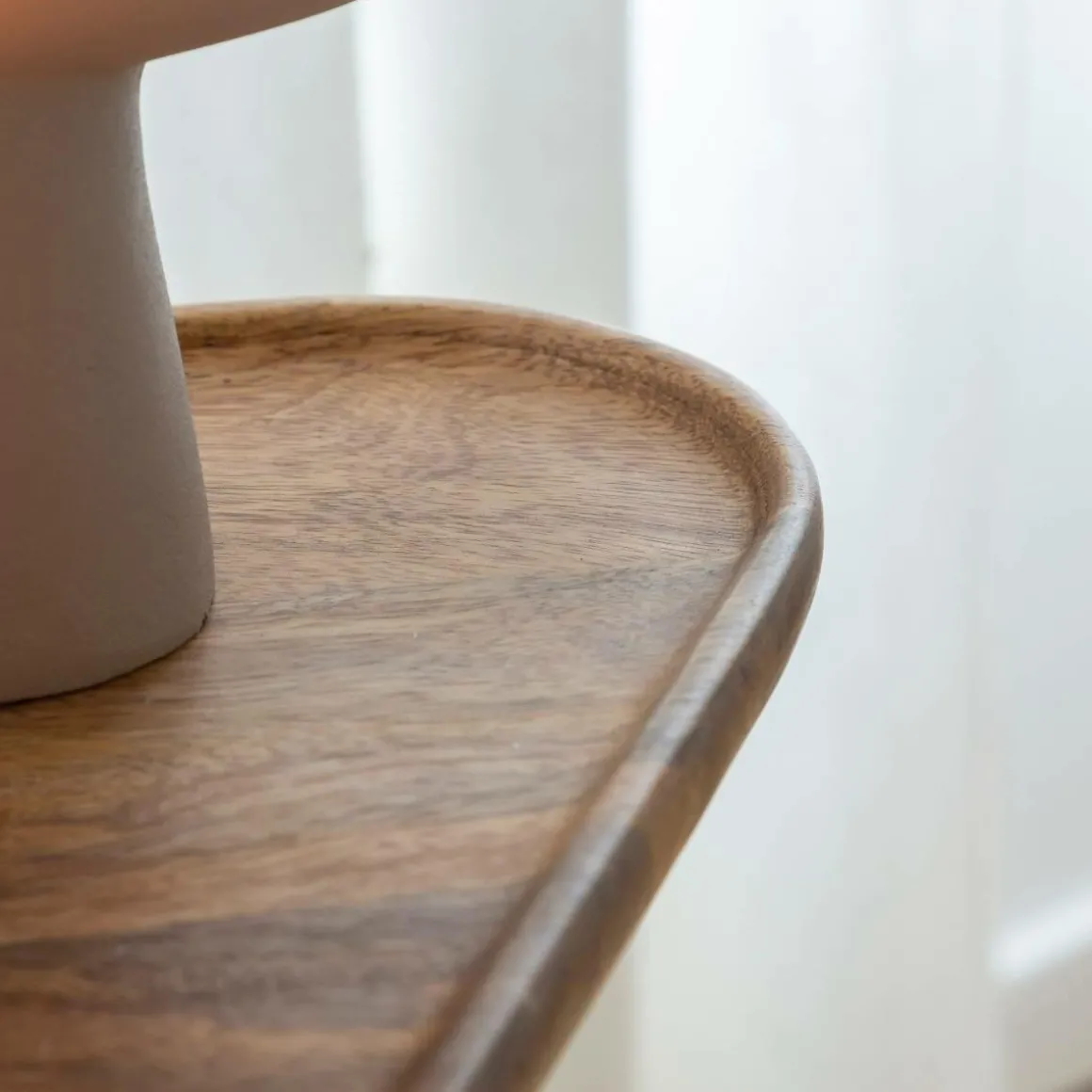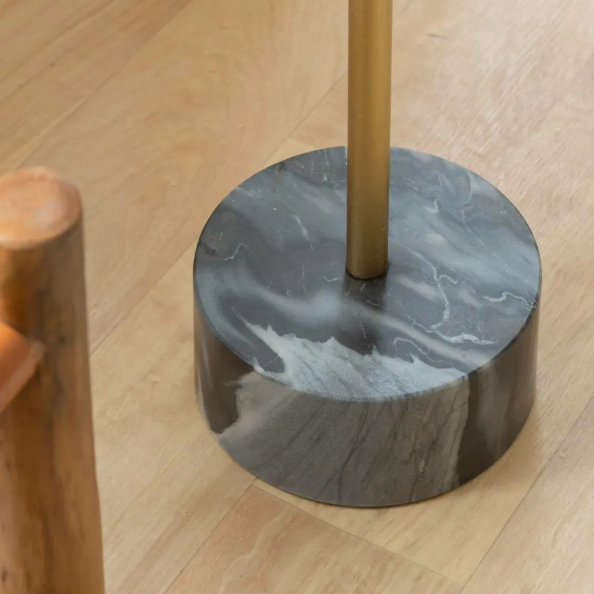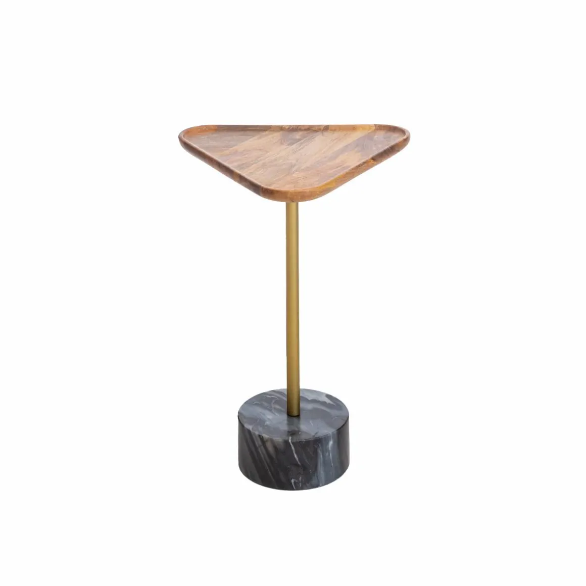 Trois matériaux sont assemblés pour créer le bout de canapé parfait. On développe : au niveau du plateau, on est sur un design triangulaire réalisé en bois de manguier. Au niveau du piétement, on est sur un socle massif réalisé en marbre gris. Une tige métallique dorée a été utilisée pour faire la jonction entre le plateau et le piétement. Ce piétement en marbre est la réelle valeur ajoutée de ce bout de canapé, il apporte une réelle élégance et en fait un accessoire de décoration de luxe.