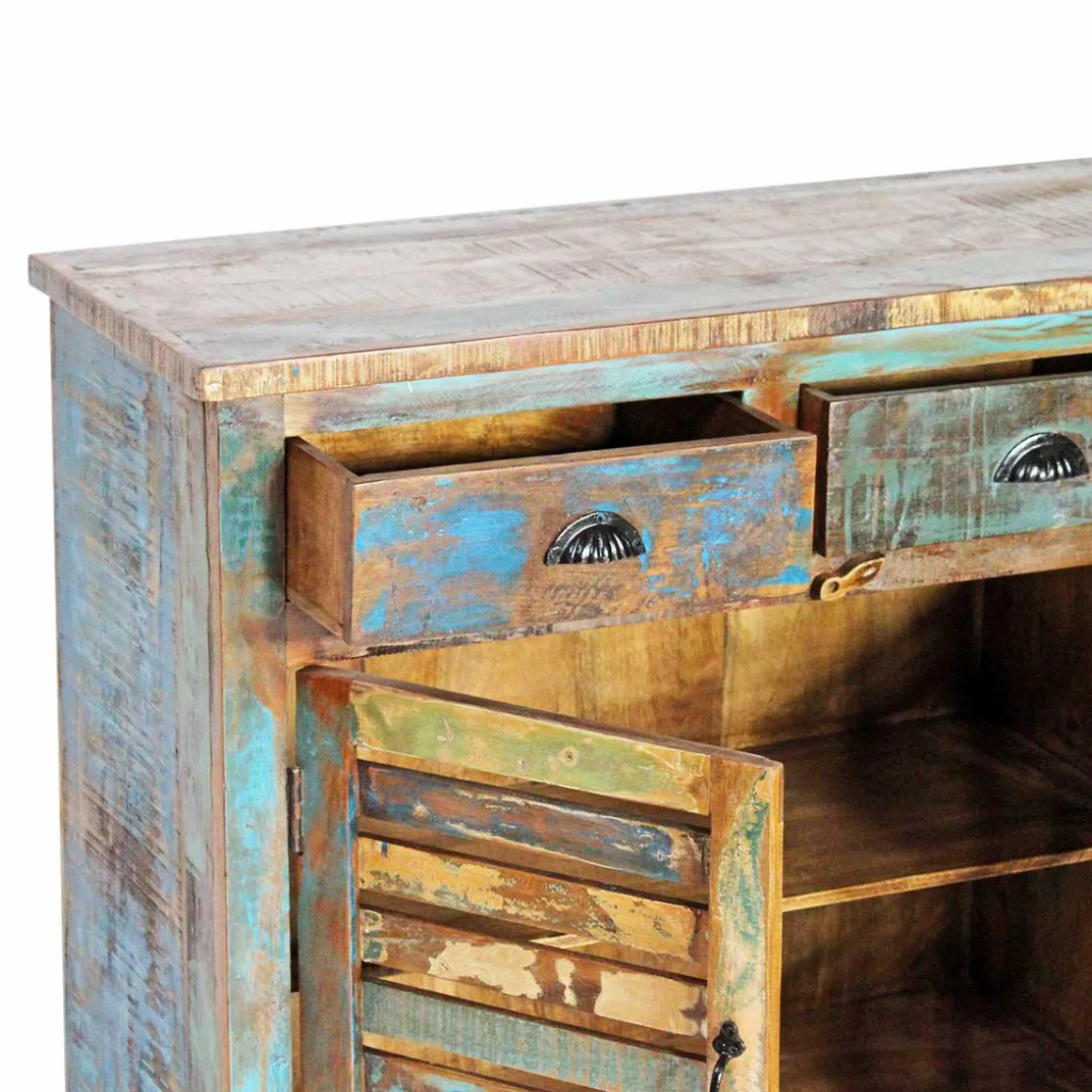 Le buffet enfilade en bois exotique à lattes recyclées est composé de 4 grandes portes et 4 grands tiroirs. Avec son espace de rangement très satisfaisant, vous pourrez ainsi stocker votre vaisselle, matériel ou tout autre objet de votre choix. L’authenticité apporté par le bois recyclé coloré de ce buffet bois massif fera de votre pièce un endroit chaleureux et unique.