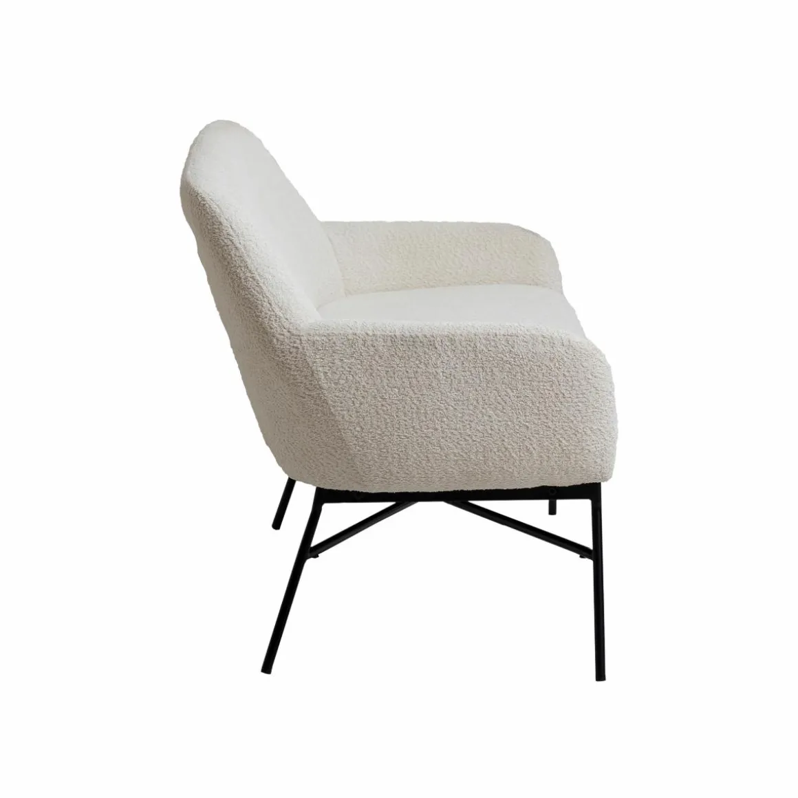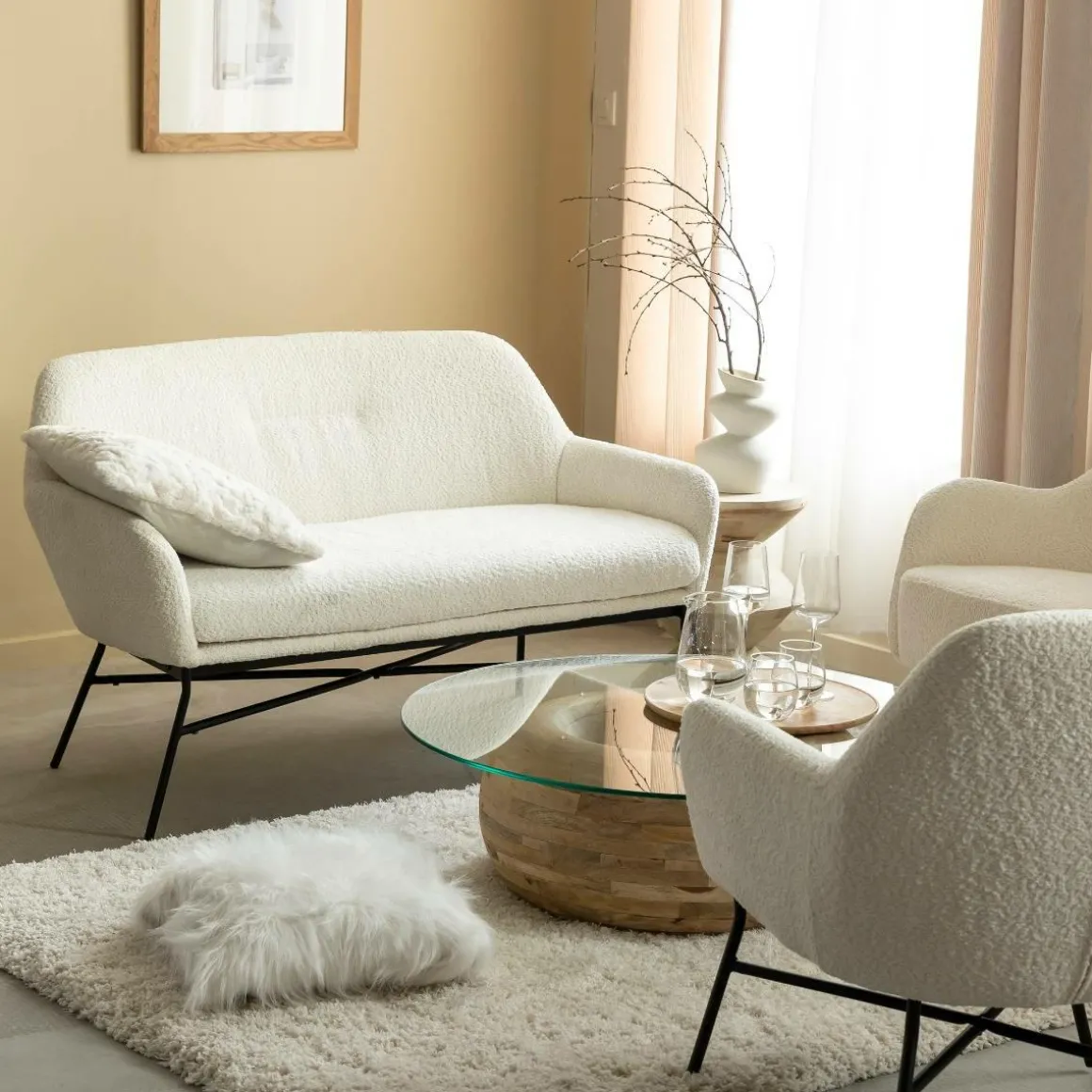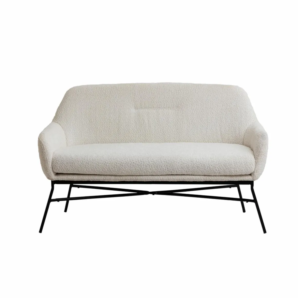 Le canapé Amandine, avec son revêtement en tissu bouclette blanc et sa structure en métal noir, combine parfaitement confort et style.