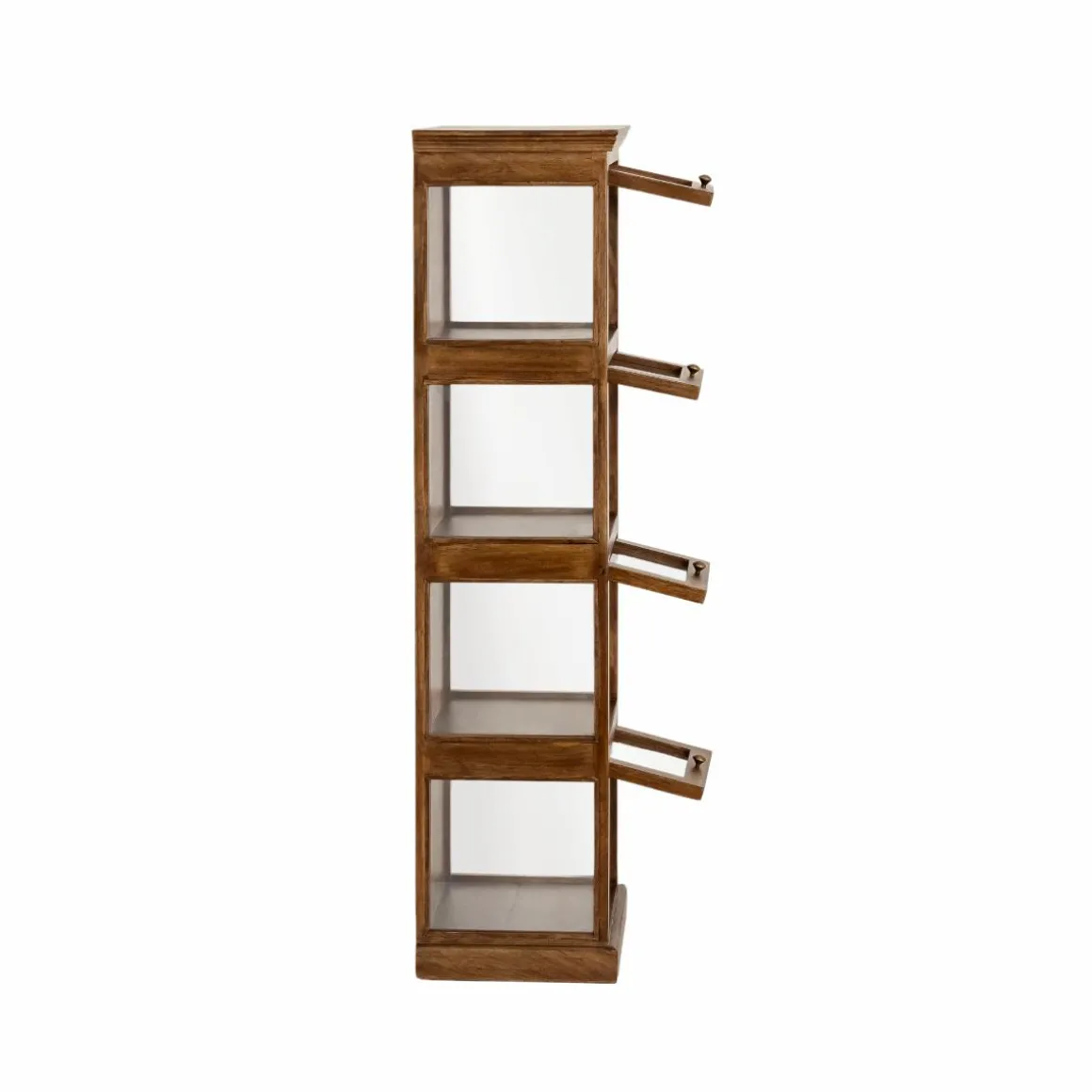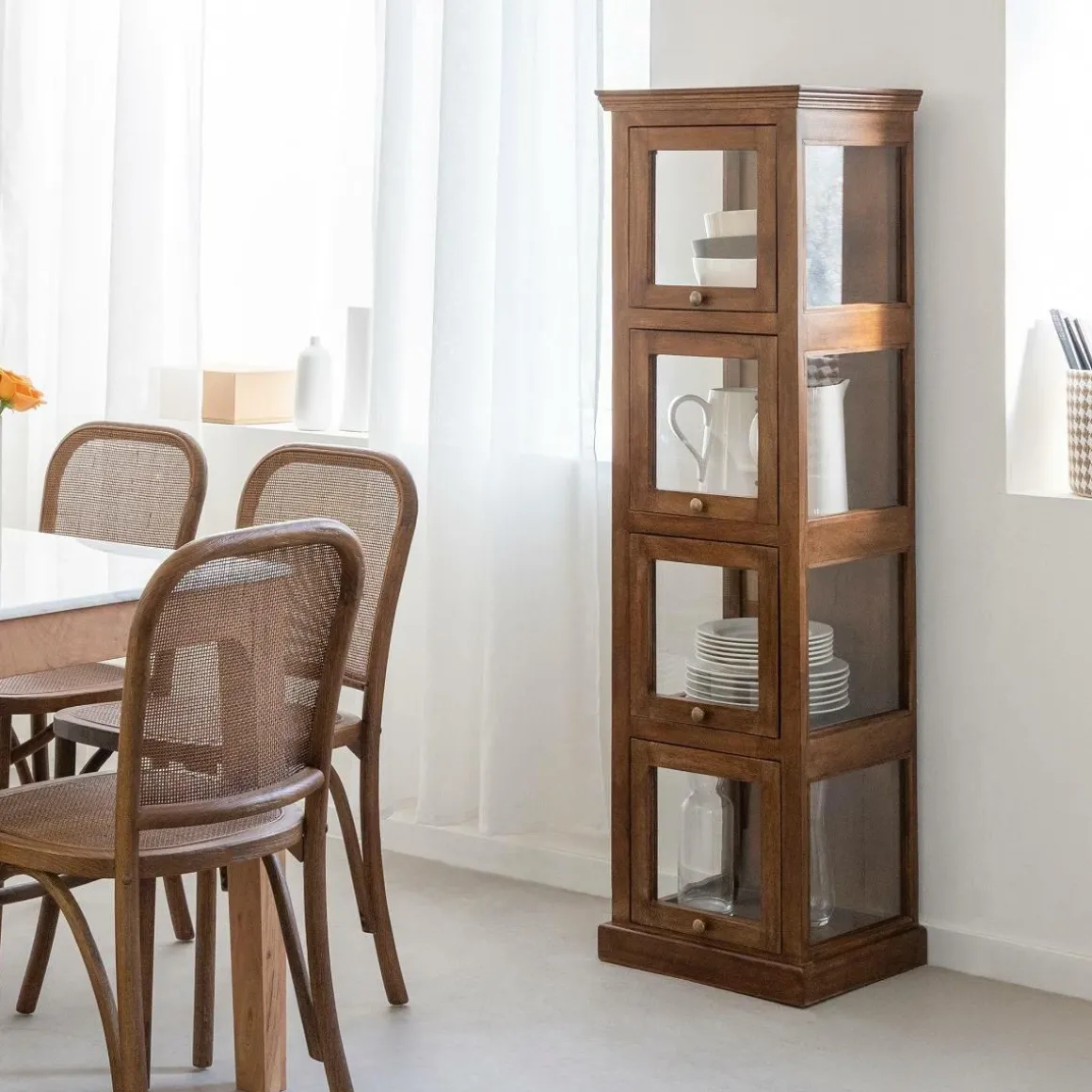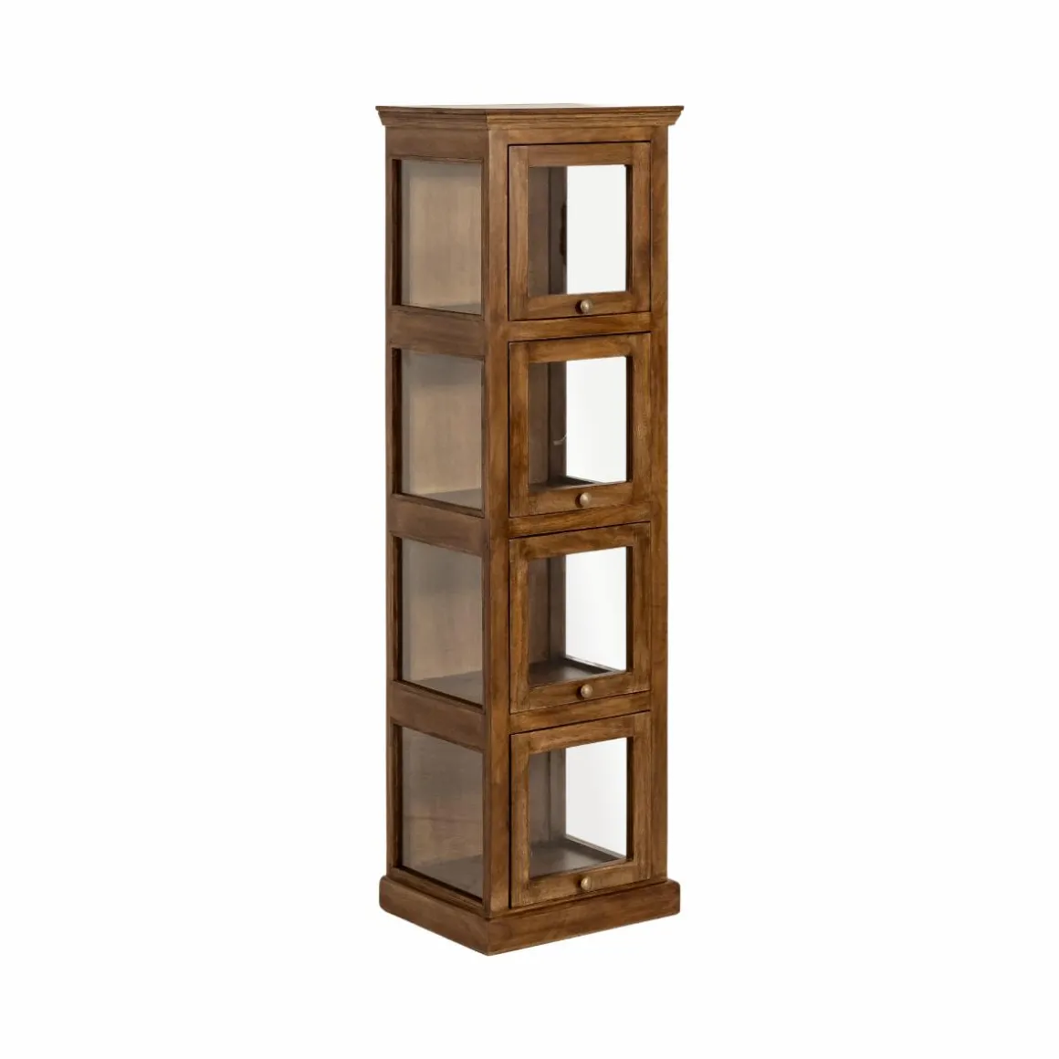 Avec sa silhouette élancée et sa façade composée de cinq portes vitrées, cette colonne Remick de rangement en bois de manguier joue la carte de l’élégance naturelle et de la légèreté visuelle. Chaque porte révèle un compartiment indépendant, idéal pour exposer de beaux objets, ranger de la vaisselle ou structurer des accessoires du quotidien avec style. Entièrement réalisée en bois massif, elle séduit par la noblesse de son veinage et la chaleur de son aspect brut.