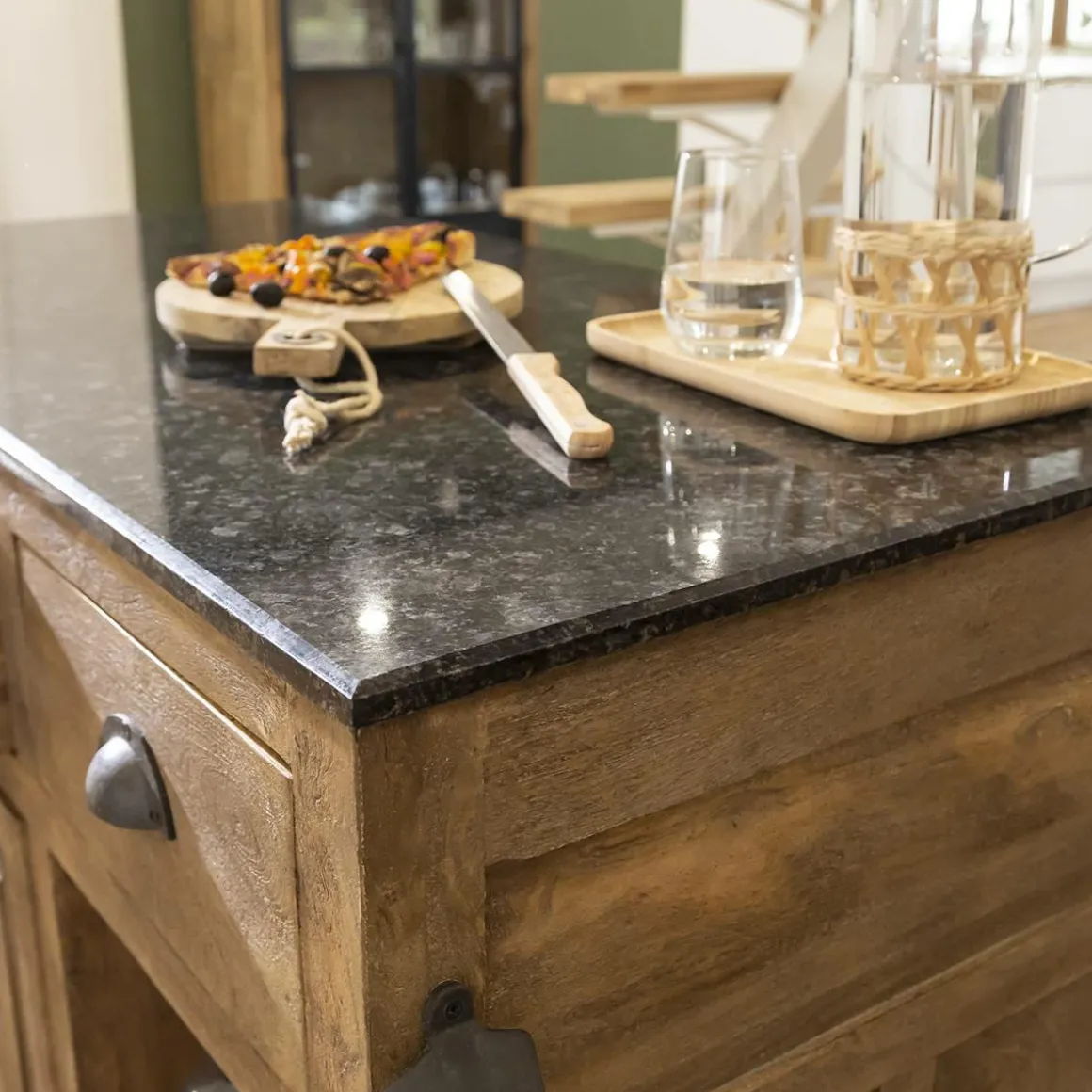 Cet îlot central en bois massif est constitué de manguier, un bois particulièrement réputé pour sa robustesse. Son plateau est fait de marbre foncé ce qui apporte sans aucun doute une touche d’originalité à ce nouvel accessoire de déco.Ces matériaux ont été sélectionnés avec soin afin de créer un meuble unique avec un style ancien qu’on adore !