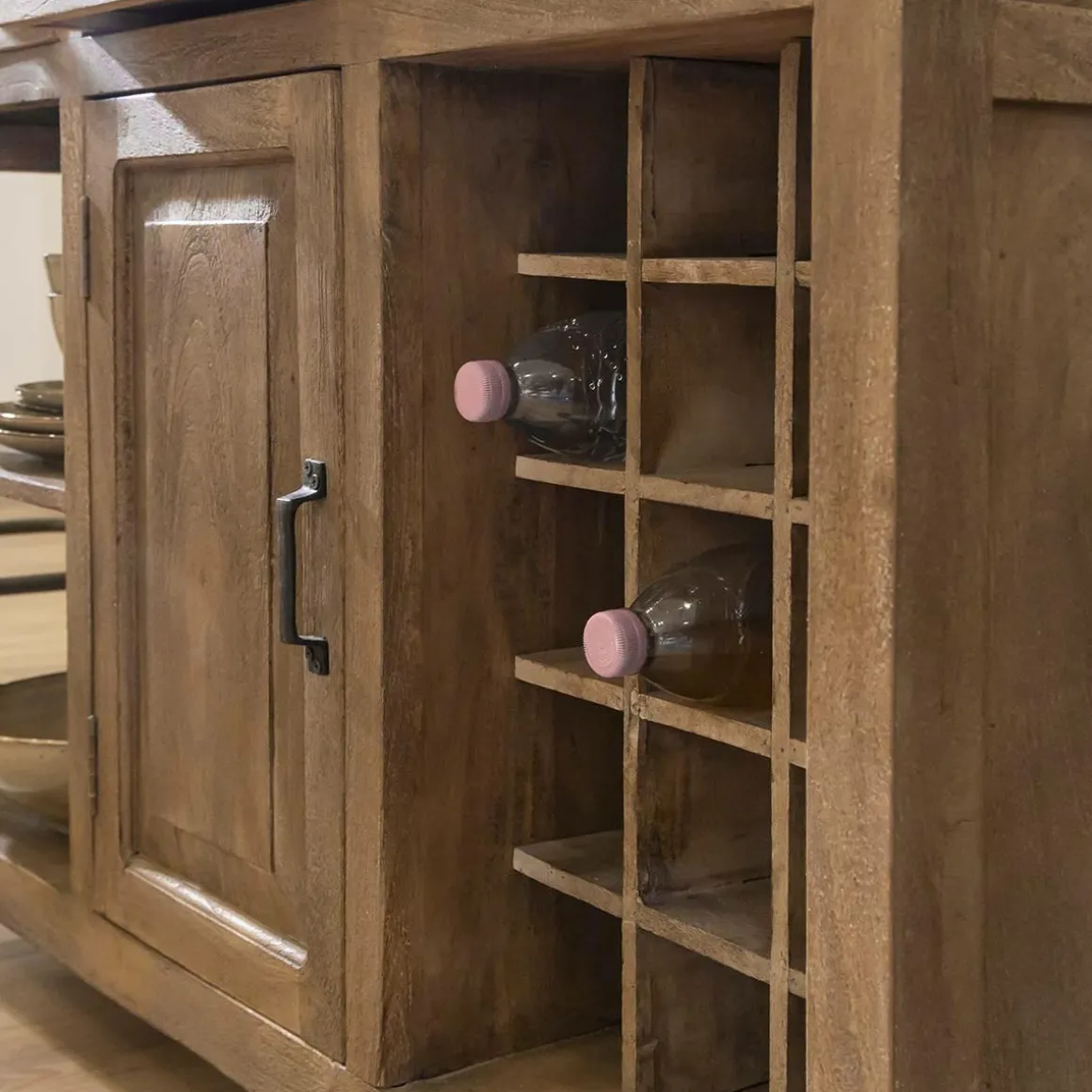 Ce meuble vous offre une multitude de possibilités de rangement. Vous pouvez profiter de deux niches et une porte qui vous permettrons de disposer mais aussi exposer votre vaisselle. Il propose de plus, trois tiroirs vous permettant de ranger vos couverts avec beaucoup de facilité. Sans oublier ses quinze casiers qui vous offrent la possibilité d’y entreposer vos bouteilles.