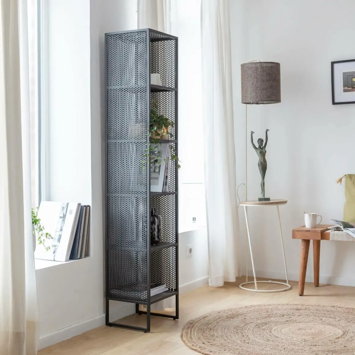 Ajoutez un style à n’importe quelle pièce avec cette lampe à la fois moderne et fonctionnelle. Elle dispose d’un piétement en métal blanc très original, d’un abat-jour en jute très moderne, et d’une étagère en bois de manguier qui mêlent style et praticité à la perfection.