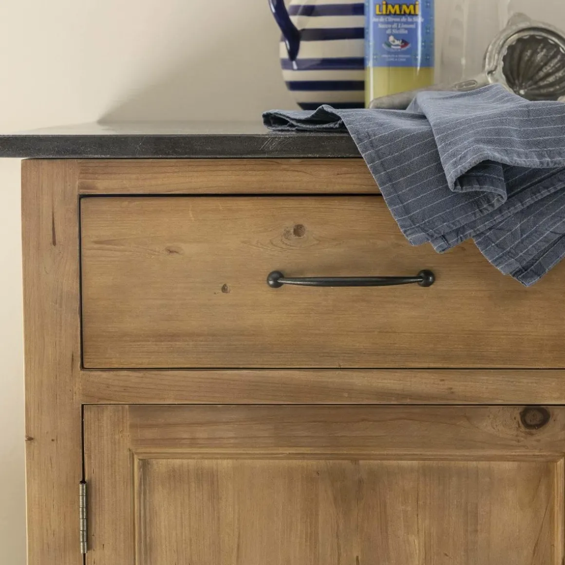 Apportez du cachet et du caractère à votre cuisine avec le meuble Chamêtre, un concentré de charme authentique et de fonctionnalité. Fabriqué en vieux pin recyclé et doté d’un plan de travail en pierre bleue, ce meuble conjugue avec brio esprit traditionnel et robustesse.