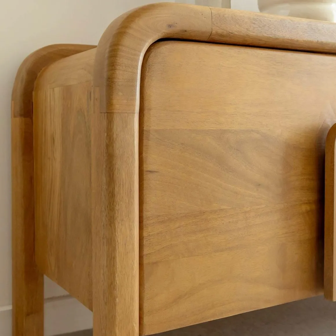 Inspiré par les formes douces et enveloppantes, ce meuble TV en bois de manguier de la collection Féodor conjugue design contemporain et chaleur naturelle. Sa silhouette tout en courbes, portée par des pieds galbés et des bords arrondis, apporte une esthétique fluide et apaisante à votre pièce de vie. Les poignées sculptées dans le prolongement des portes renforcent l’élégance minimaliste du meuble.