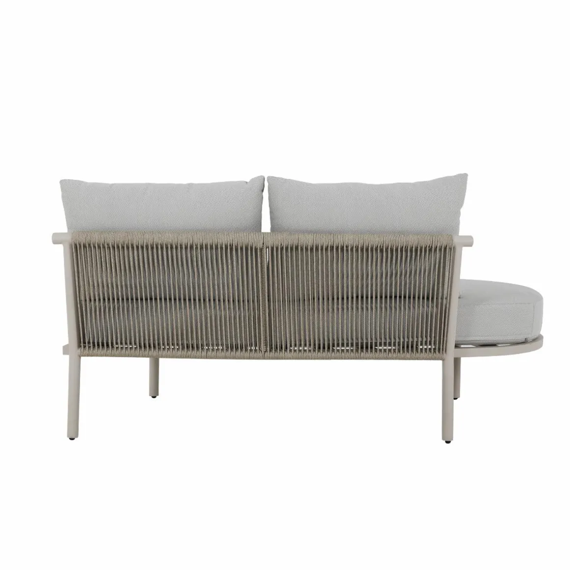 Le salon de jardin Zion allie style et confort avec sa table et son canapé en aluminium taupe, au design en forme organique, parfait pour cette année 2025. Le dossier du canapé en corde ajoute une touche subtile et design, tandis que les coussins offrent un confort optimal pour des moments de détente.