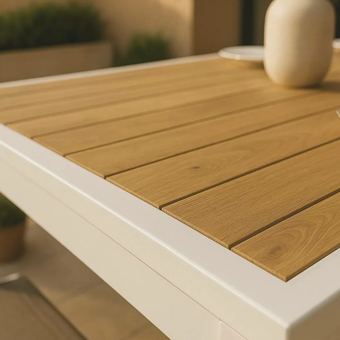 Le contraste entre l’aluminium blanc et le plateau effet bois crée une atmosphère chaleureuse et moderne. Facile d’entretien et durable, elle s’intègre dans tous les styles d’intérieur.