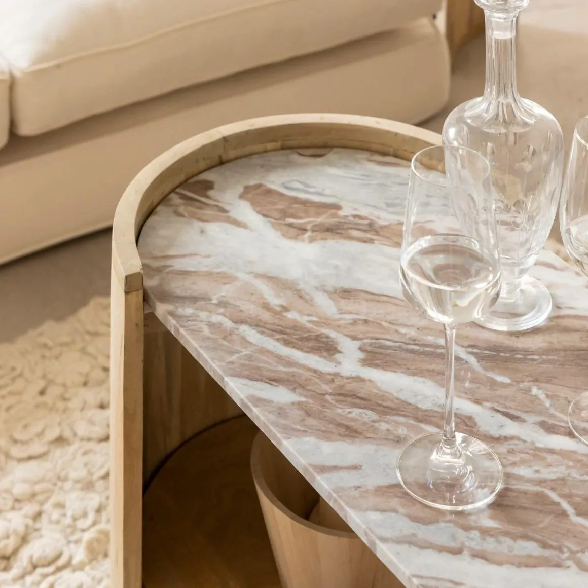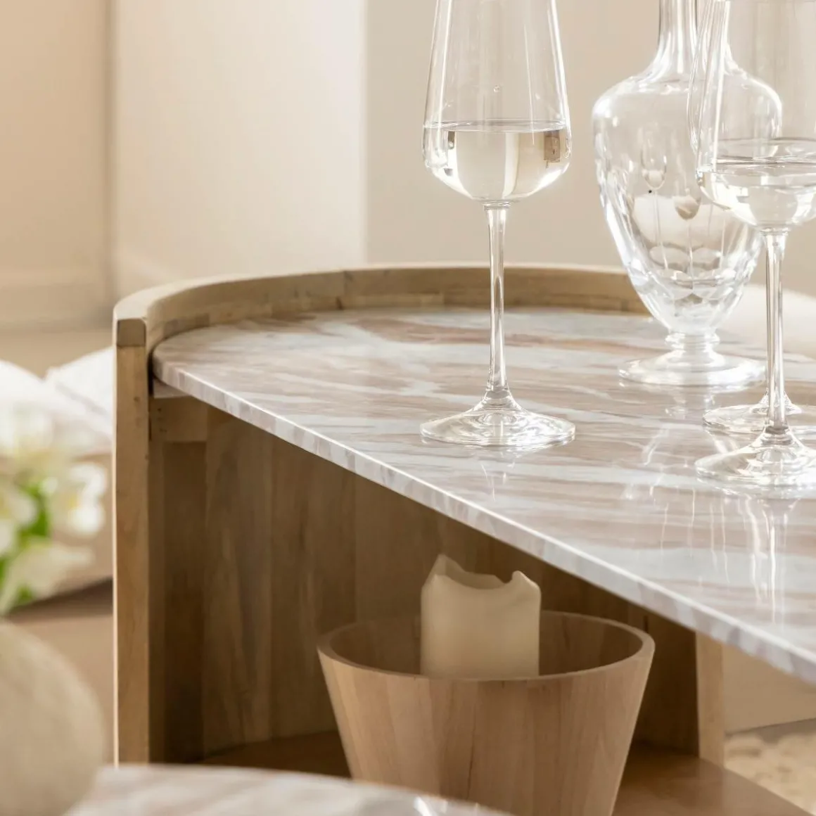 Fabriquée en bois de manguier, elle se distingue par son plateau en marbre raffiné. Ses angles arrondis et sa forme ovale ajoutent une touche de douceur à son esthétique.